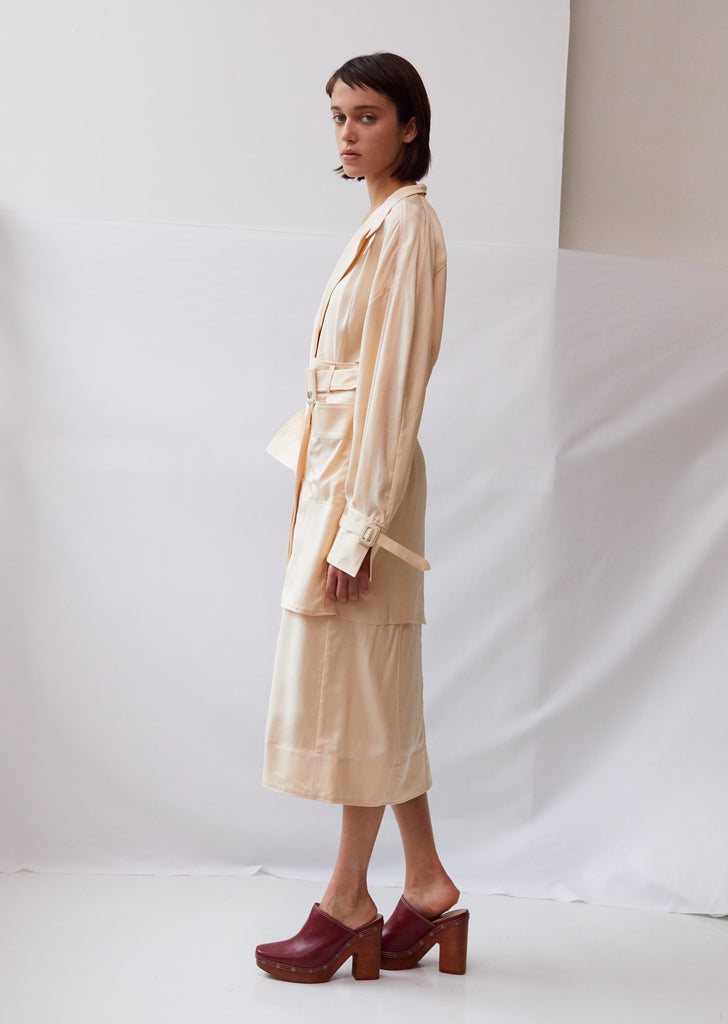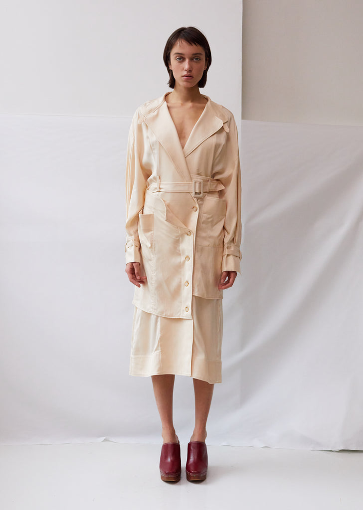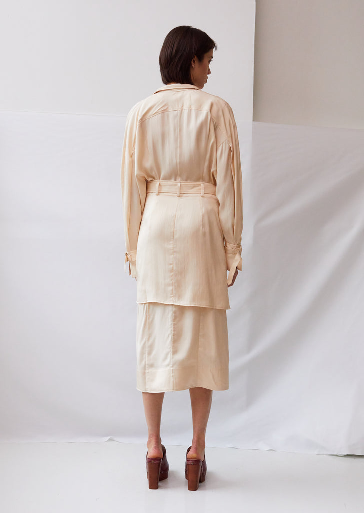 Trench coat-inspired belted midi dress in beige silk-blend twill, finished with a layered gored button skirt with apron-style front patch pockets. Notch lapels. Angled tabs at collar. Drop shoulders. Blouson sleeves. Split cuffs. Flat sleeve straps with tonal slide-adjuster buckles. Flat self-belt with tonal slide-adjuster buckle. Horn-button placket at skirt. Darting at back waist. Wrap-around, partially attached top skirt layer fastens at button placket. Straight, over-the-knee hem. Straight, slightly loose fit.