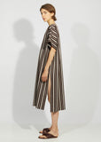 Brown-and-white stripe-knit caftan in cotton yarn, featuring a V-neck and upper-thigh side slits.