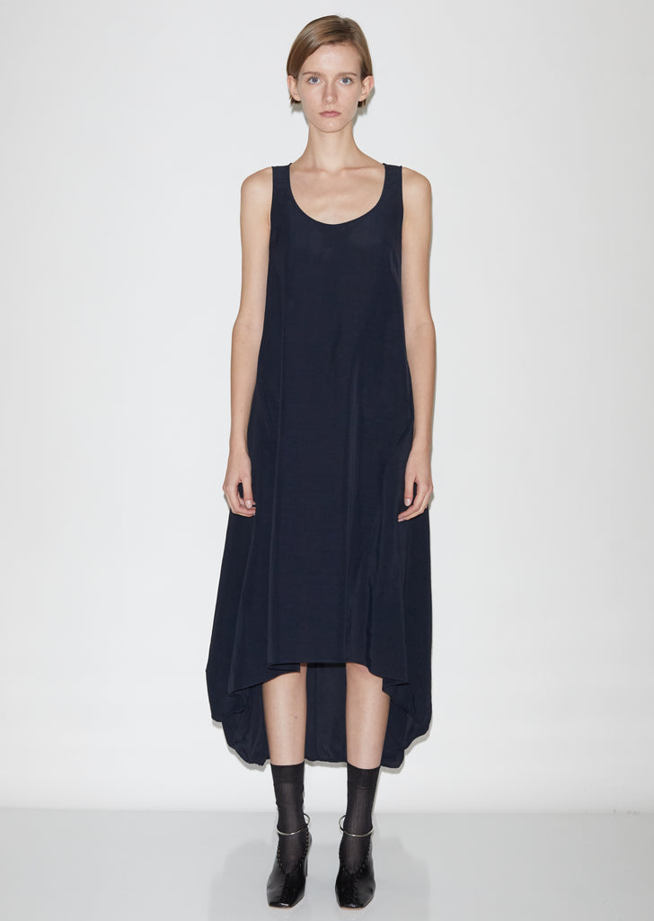 Black midi tank dress in a fluid, semi-lustrous silk-viscose plain-weave, designed with a curved high-low hem.