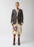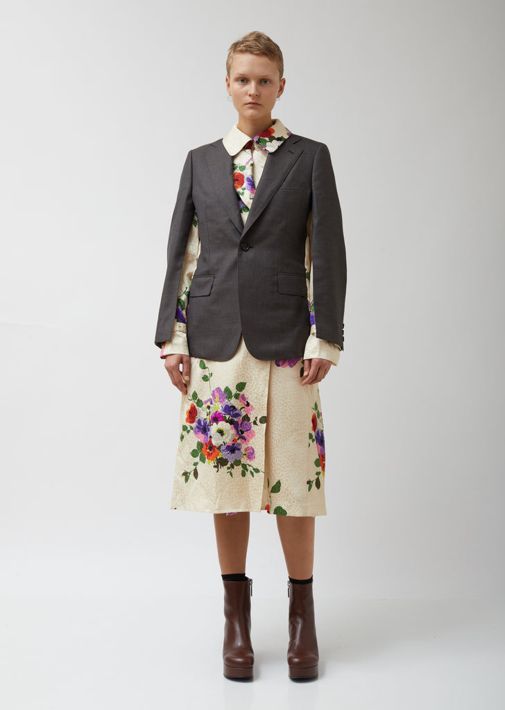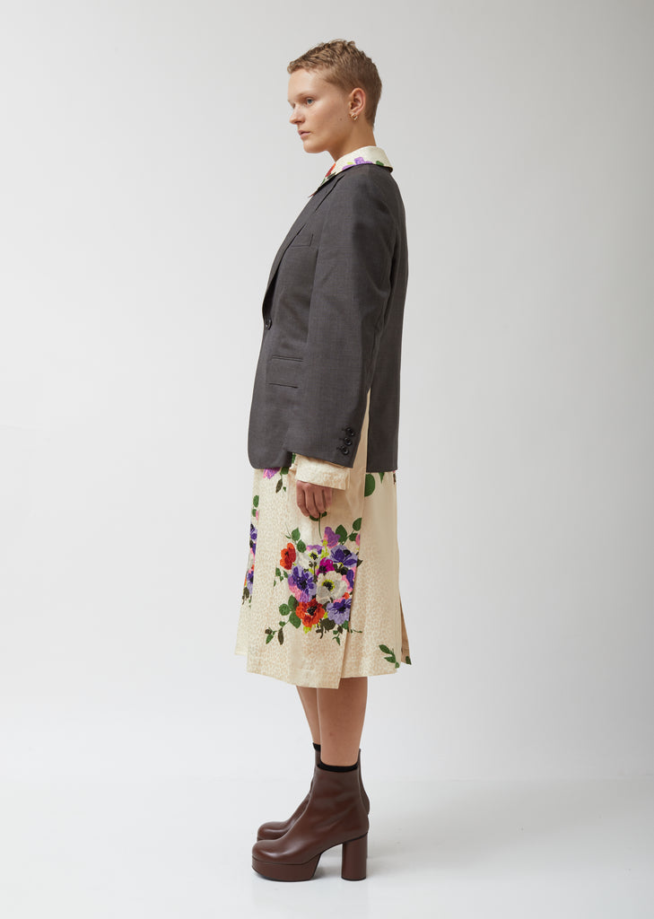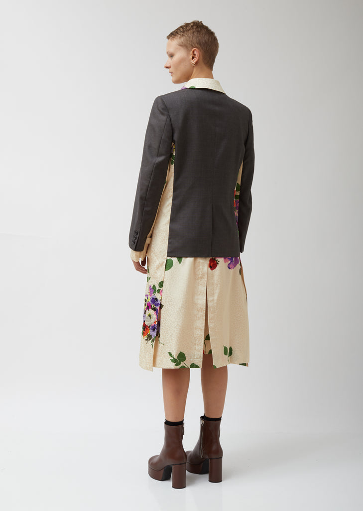 Knee-length silk-jacquard shirtdress in a red-green-and-violet floral print against a light-beige leopard backdrop, layered under a tailored grey wool-sharkskin single-breasted jacket. Rounded-edge spread collar/notch lapels. Long sleeves: three-button sleeve vents on jacket portion, pin-buckle sleeve straps on dress portion. Partially concealed double-breasted front closure on dress portion; coordinating pin-buckle belt. Single-button fastening on jacket portion. Jacket overlay also includes a stand chest pocket, waist darting, flap besom side pockets, and center-back vent. Box-pleating at back of skirt. Straight hem. Classic fit.
