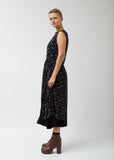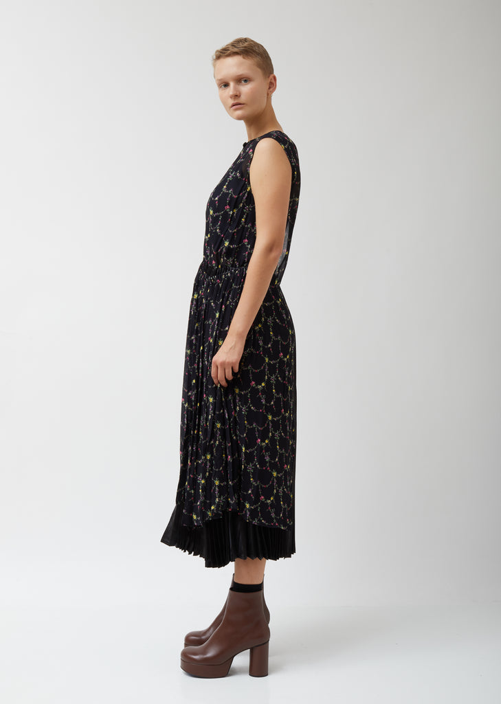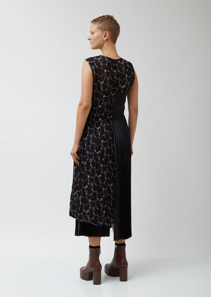 Sleeveless, pleated black satin midi dress finished throughout with pink-yellow-and-black georgette overlays and underlays. Illusion neckline: spaghetti-strap-V-neck/round. Two-button keyhole detail at round neckline. Paneled bodice. Seamed at high waist. Plissé-pleated skirt. Zip closure at side seam. Hem falls to lower calf. Classic fit.