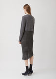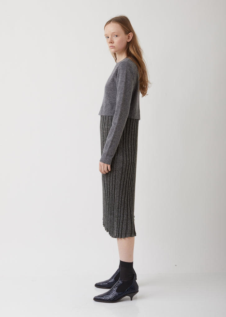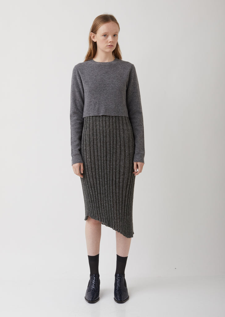 Knitted midi dress with a boxy, layered sweatshirt-style bodice and a pleated straight skirt, both imagined in a fossil-grey wool-linen blend. Pulls over. Crewneck. Long kimono sleeves. Angled, asymmetric hem. Straight, relaxed fit.