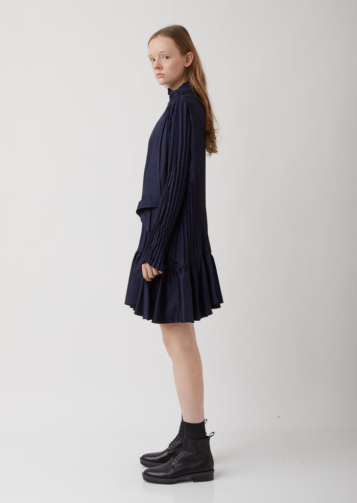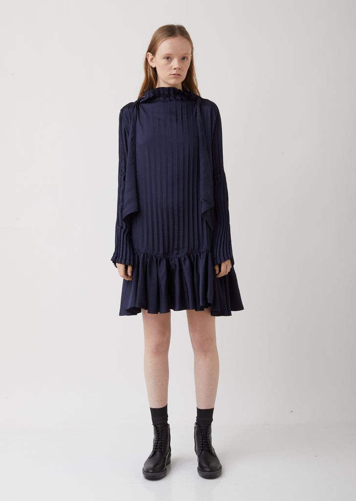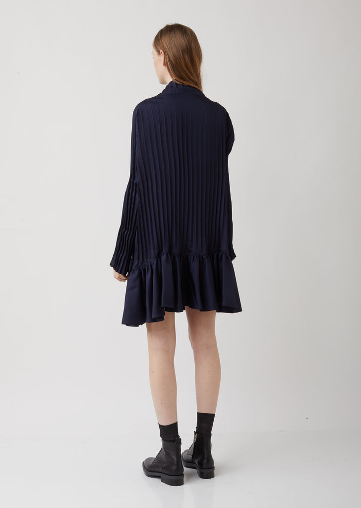 Navy satin-twill accordion-pleated minidress, finished with a draped tie-neck detail and a gathered flounce hem. Pulls over. Fluttered high neck. Exaggerated long sleeves. Hem is slightly curved in back. Straight, loose fit.