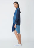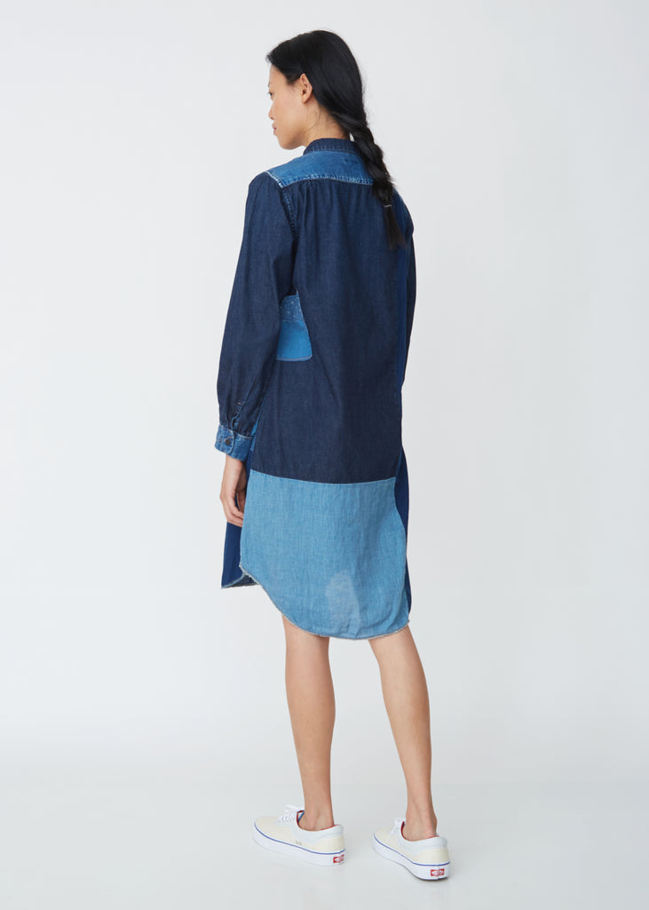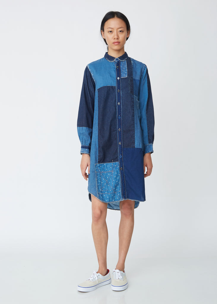 A straight-cut shirtdress, intricately patchworked in shades of indigo-dyed denim and linen with distressed detailing throughout.
