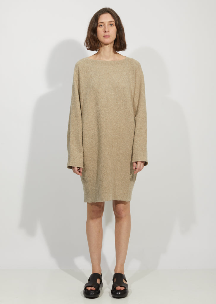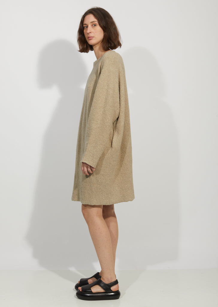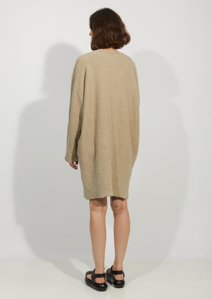 Grey-beige cocoon dress in a stretchy, cotton-blend horizontal bouclé knit.