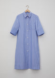 Margaret Howell’s half-sleeve shirtdress is crafted from a blue-and-white cotton chambray woven with vertical pyjama stripes. It’s cut with a slight trapeze silhouette and finished with solid-color banded cuffs for contrast.