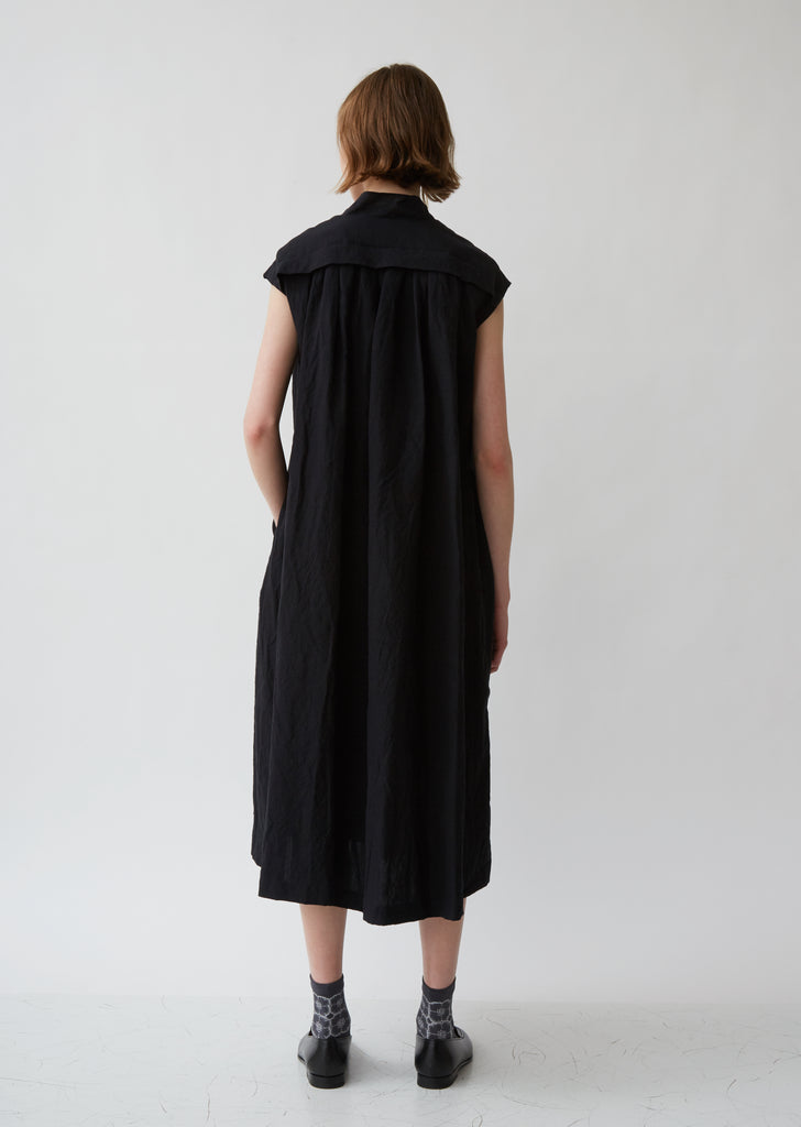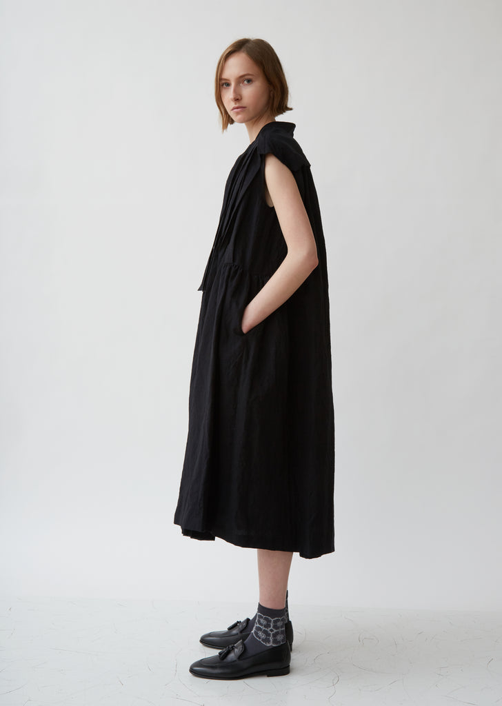 A vintage-inspired, high-waist sheath dress from the Japanese house of Minä Perhonen, borne from the philosophy that beautifully made clothes should last a lifetime. Tie neck. Cape shoulders descend into inverted triangle of sharp pleats in front. Relaxed pleats on front of skirt. Color: White. 50% Cotton, 50% Linen. Made in Japan.