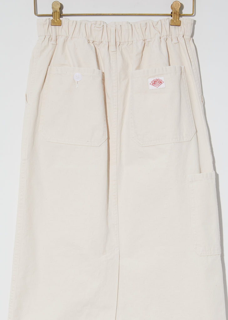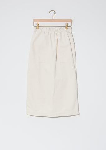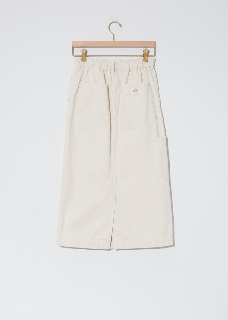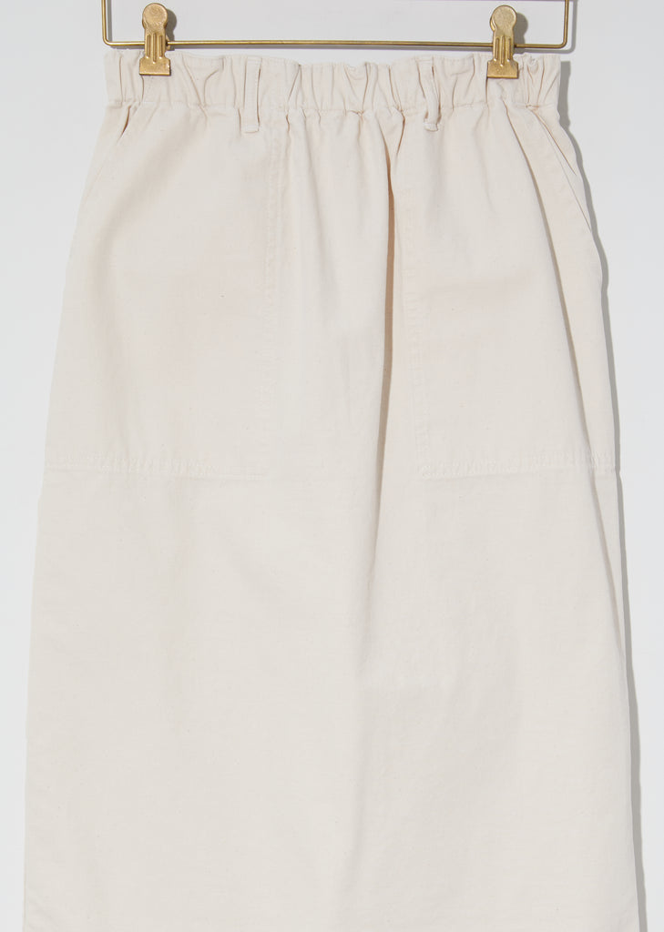 Fall/Winter 2020 Collection — Danton Cotton Serge Skirt in Ecru. Crafted in brand signature cotton serge fabric, elasticated waistband straight skirt with angled cargo side pockets and back vent.