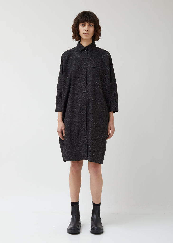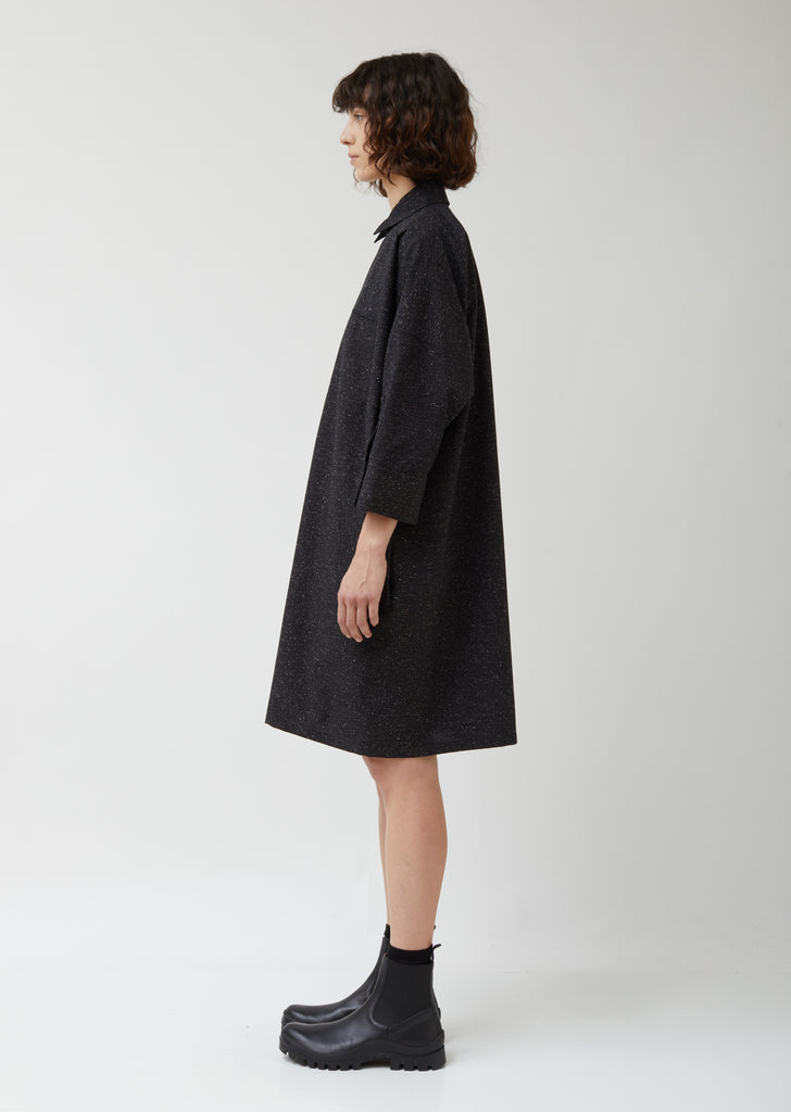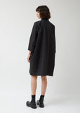 Black dolman 3/4 sleeve button-up A-line dress in mid-weight cotton/wool/slubbed silk/linen blend.  Welt chest pocket, spread collar, and barrel cuff. Also available in Light Beige.