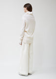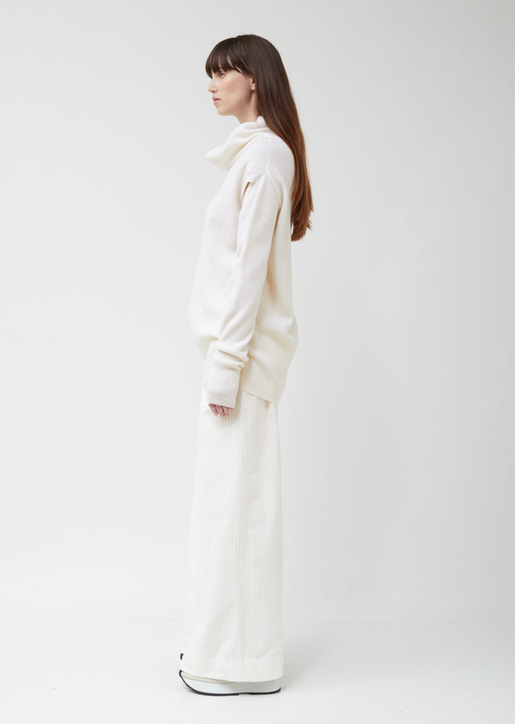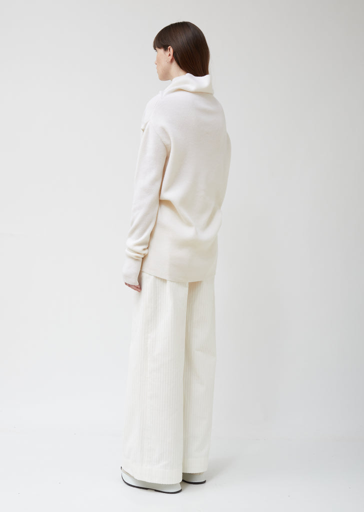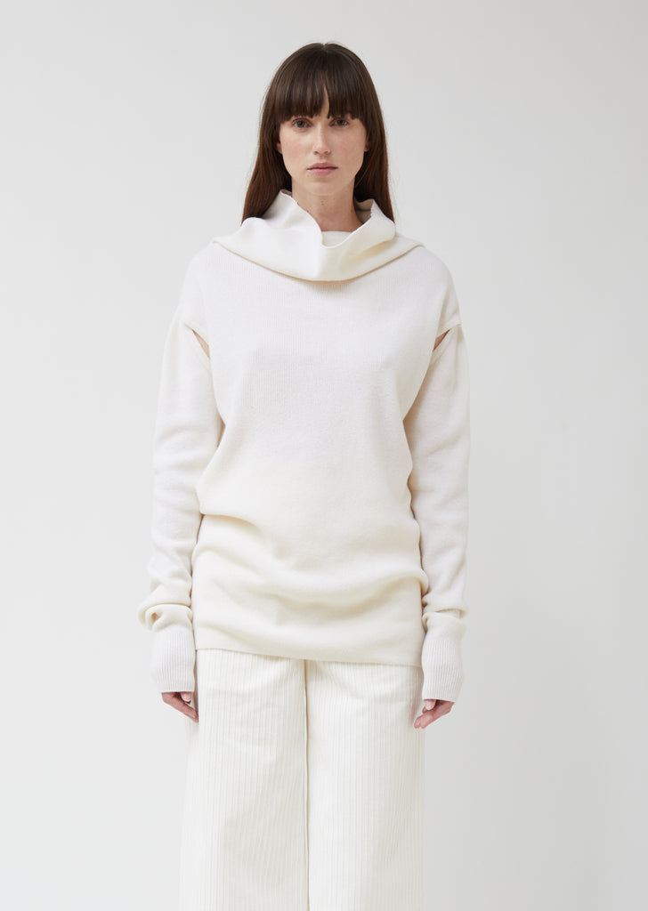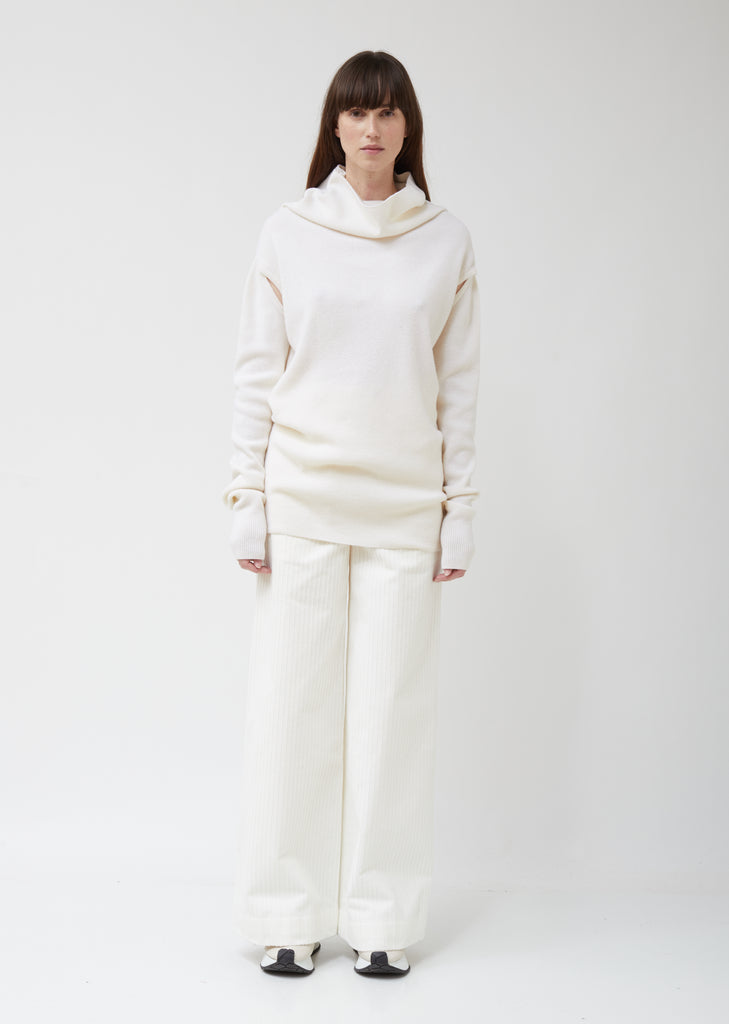 Fine-ribbed knit pullover in ivory virgin wool, designed with a wide cowl neck and elongated sleeves. Elongated straight hem falls to upper thigh. Slouchy fit.