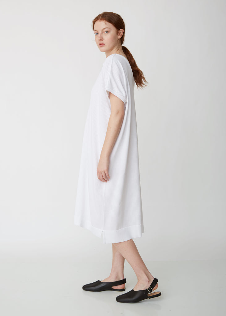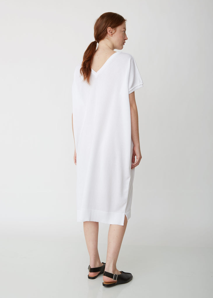 New from Nehera: Chalk white ribbed dress in soft organic cotton. Relaxed fit with an open v-neck. Mid-length hem. Draped effect at the hem with split seam detailing. Ribbed trim at the cuffs and neck. Color: White. 100% Cotton. Imported.