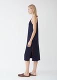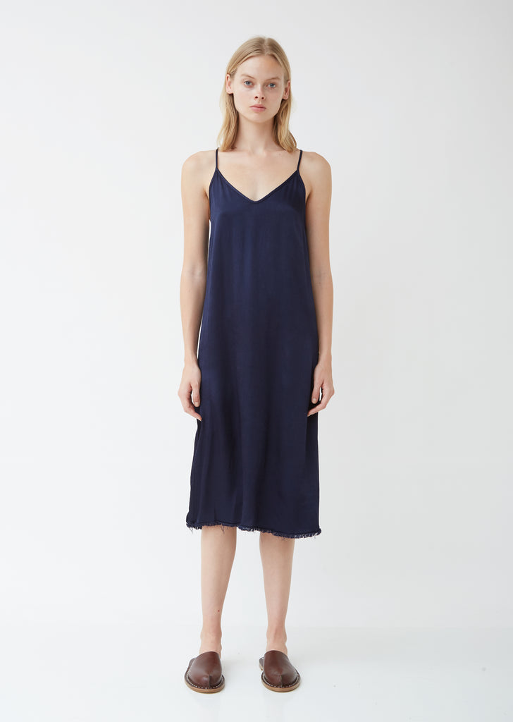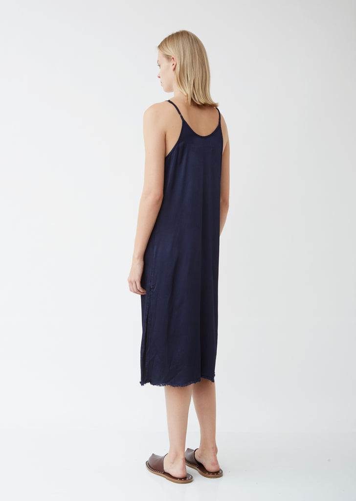 Navy satin slip dress with side-seam. Slip-on style. Straight-fit bodice. Adjustable spaghetti straps. V-neckline. Sides are vented to mid-thigh; creates a slightly flared silhouette on the skirt. Frayed midi hem.