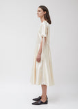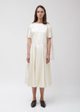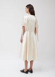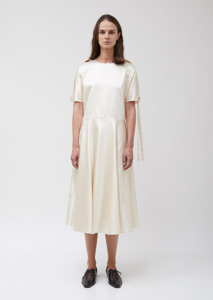 Short-sleeve A-line midi dress in ivory satin, adorned with coordinating draped bows at the shoulder seams and sleeve hems. Step-in style; concealed back zip. Crewneck. Seamed at natural waist. Softly gathered skirt; fabric drapes into folds. Classic fit.
