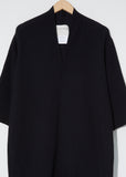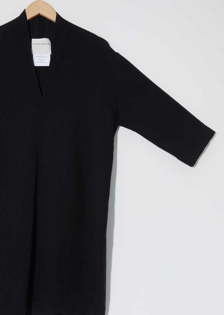 FW'20 Collection — Stephan Schneider Records Dress in Ashes. Black V-neck wool tunic dress with sweater knit front panel and three-quarter length sleeves.