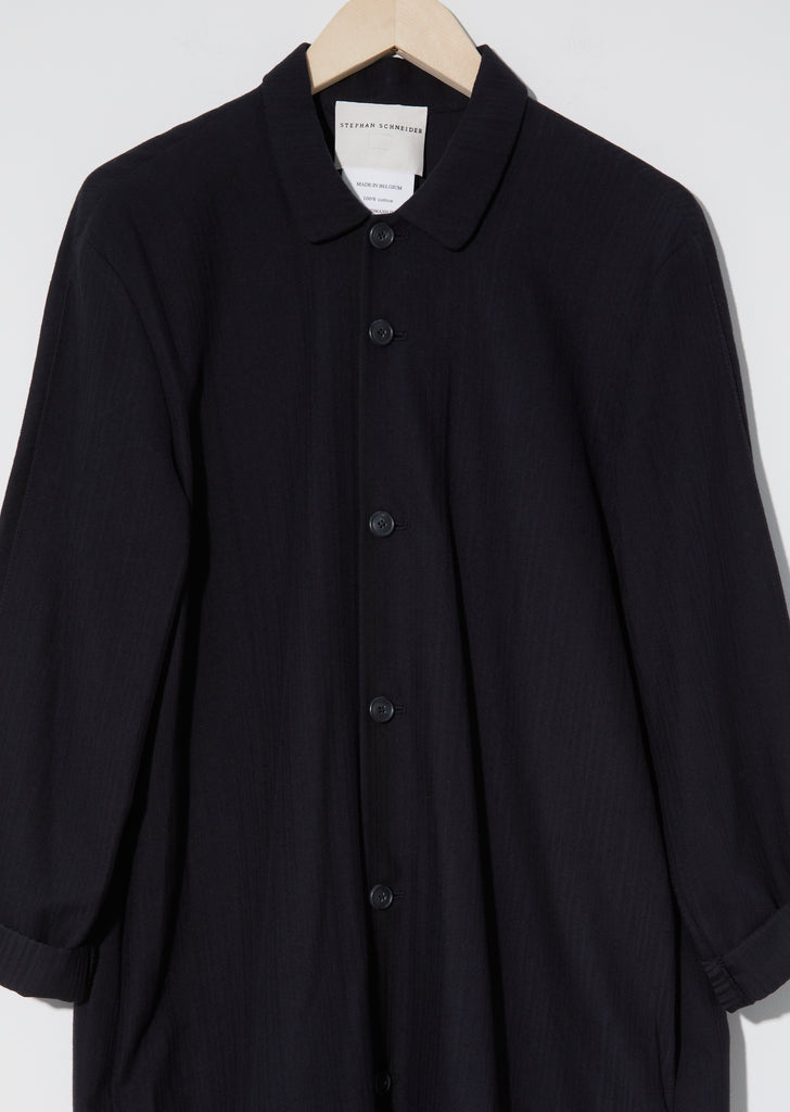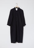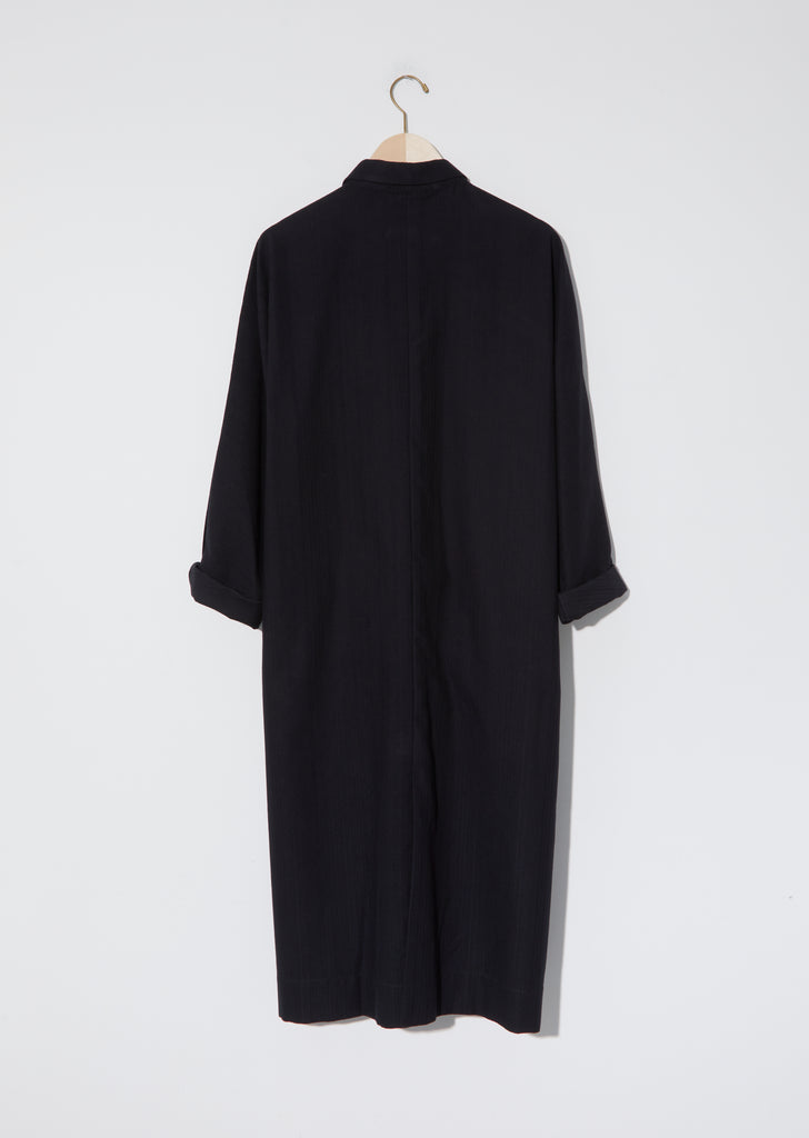 FW'20 Collection — Stephan Schneider Linguistic Dress in Black. Long shirt dress with dolman sleeves in a soft, brushed shadow stripe cotton with tonal buttons. Sleeves shown rolled.