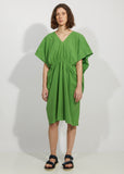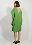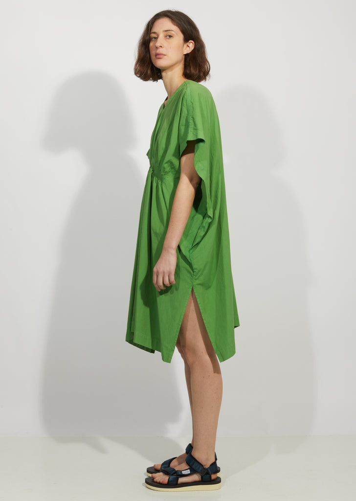 Green midi tunic dress cut from cotton-blend poplin. Designed with a V-neckline, short batwing sleeves, and a high inverted-V waist insert at the front.