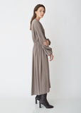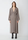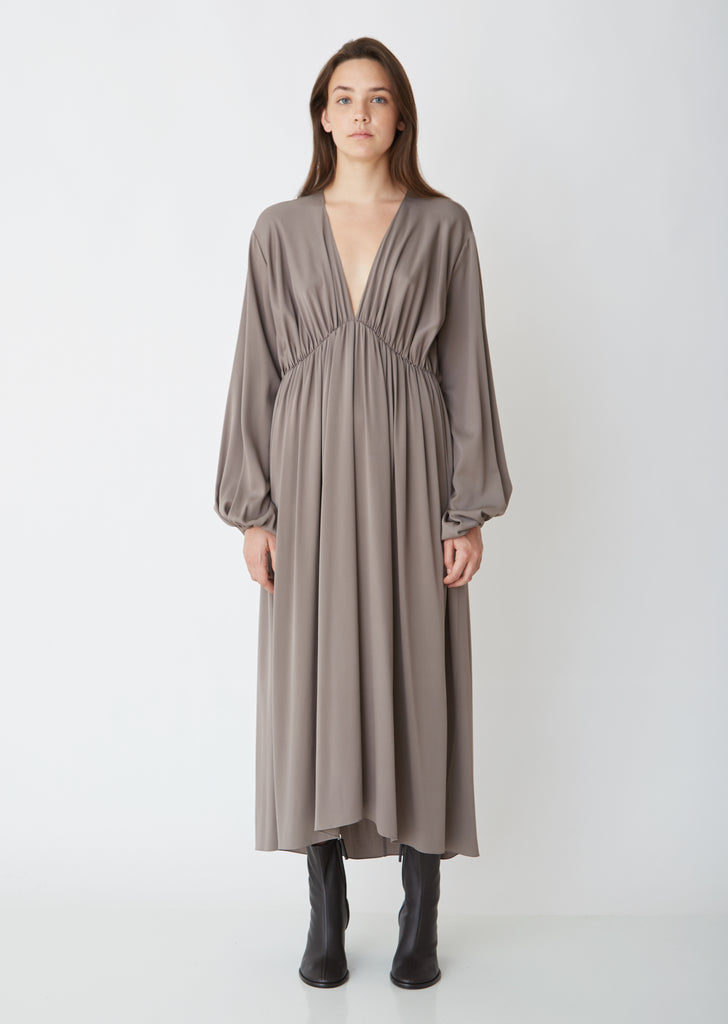 The Row's pleated Sasha dress in grey-moss silk georgette. Fluid, lightweight slip-over dress with a deep V-neck. Ruched empire waist. Finished with slip pocketing at the waist and blouson sleeves. Color: Grey Moss. 93% Silk, 7% Elastane. Made in Italy.