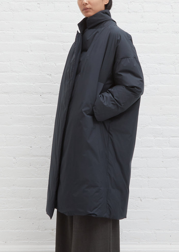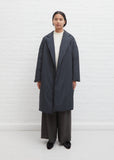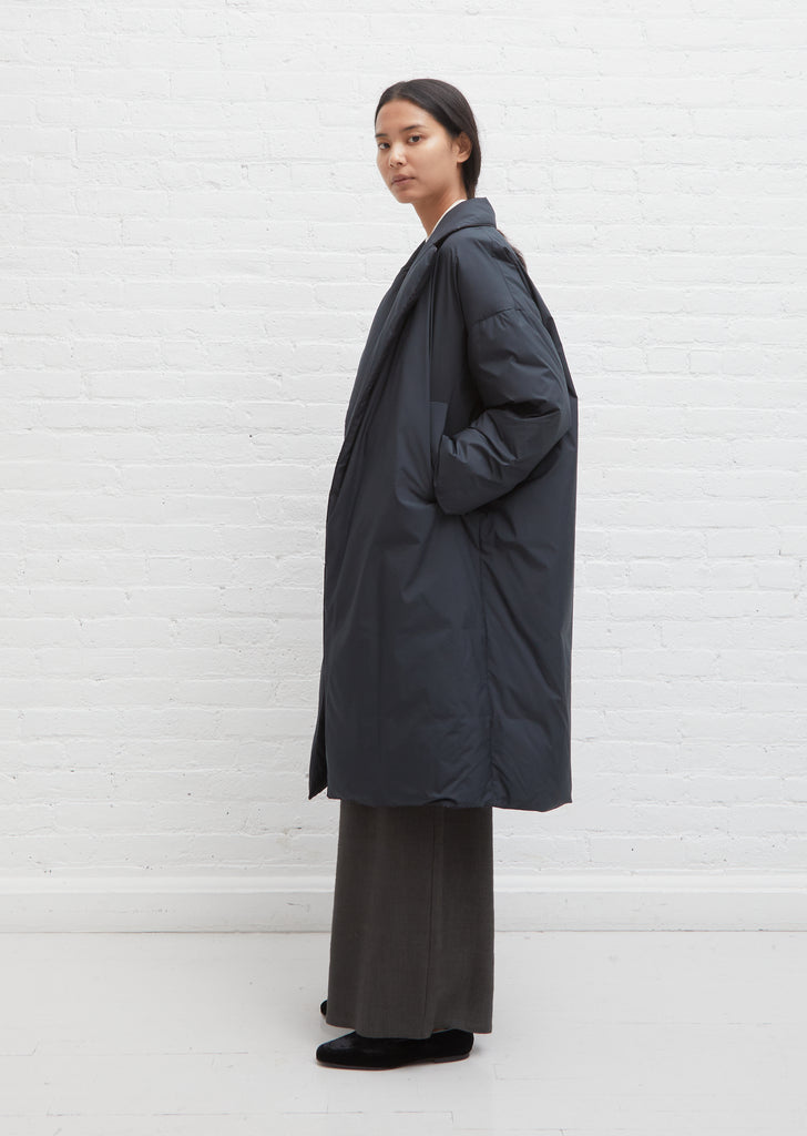 Dušan signature featherweight duvet coat with natural duck down filling in graphite grey. Features a classic notch collar, dropped sleeves and side welt pockets. Finished with tonal piping trim along collar and center front. Fully lined in self fabric.