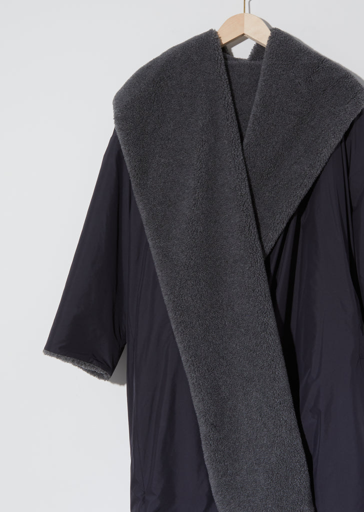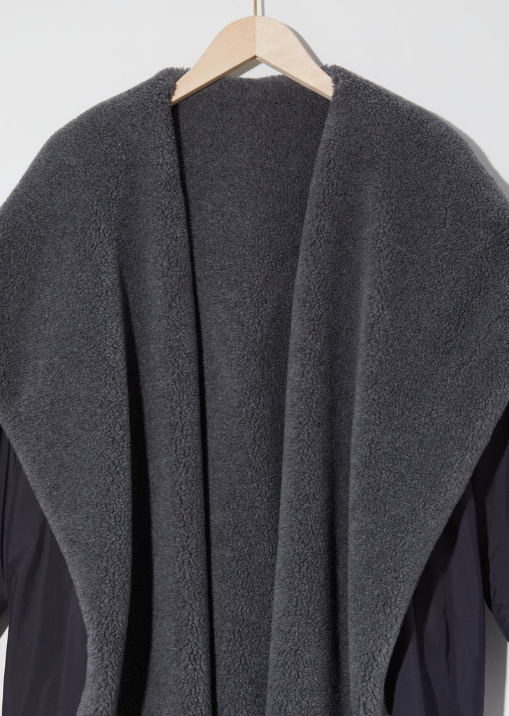 Dušan Hooded Coat in Charcoal. Reversible hooded coat crafted of charcoal-toned polyester to one side, and faced with a blend of virgin wool and cashmere sherpa in a lighter grey. This lightweight and versatile coat features a wide shawl collar that extends to an oversized hood.