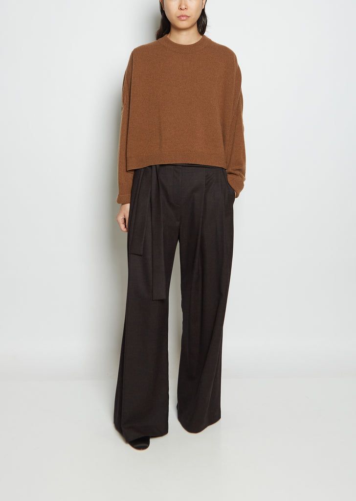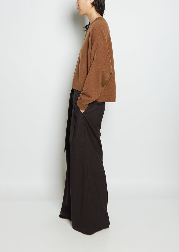 Dušan signature crewneck sweater in rich brown with a boxy fit and dropped, loose shaped sleeves in pure cashmere.  Features a back yoke with seam detail. Rib trim at neckline, folded sleeve cuffs and hem. Also available in Black.
