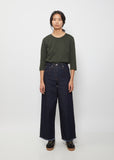 Dries Van Noten high waisted wide leg jean in indigo denim with fringed hem detail. Features 5 pocket styling with a cropped fit. Gold tone button and zip fly closure. Relaxed fit.
