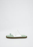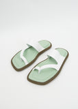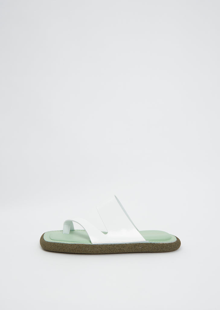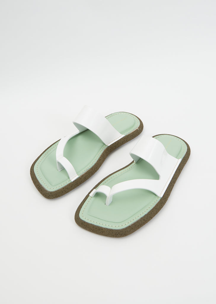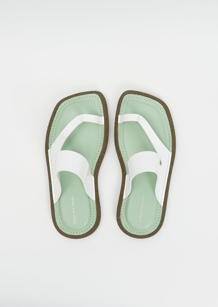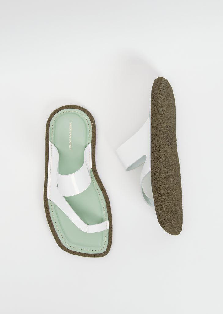 Dries Van Noten white asymmetrical strap flat sandals with toe ring in a smooth structured leather.