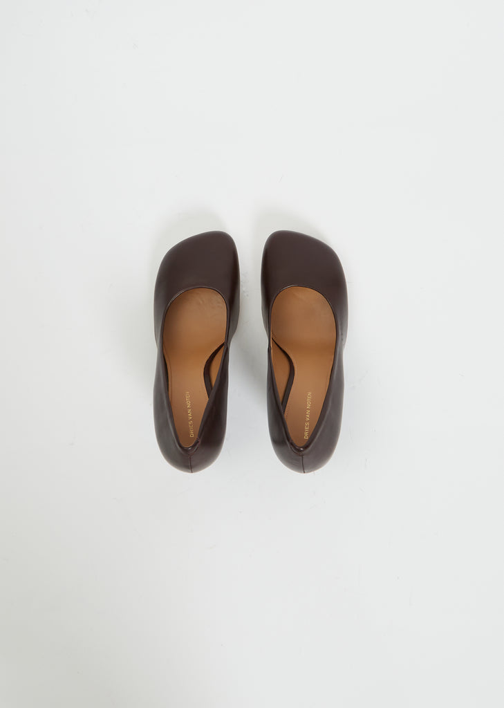 Dries Van Noten bordeaux-toned square-toe pump with a curved heel in smooth leather.