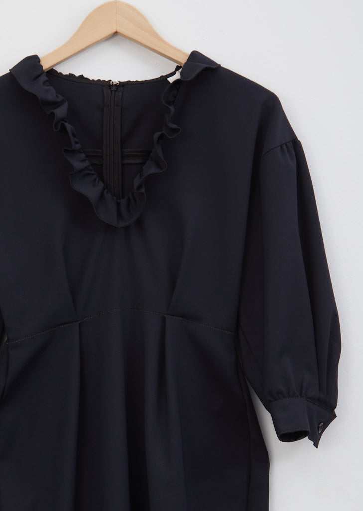 Wales Bonner Lydia Frill Collar Dress in black. Crafted in a cotton and nylon blend mid-weight scuba fabric with stretch, this dress features a frill collar and three-quarter balloon sleeves on a fitted silhouette with tuck detailing at front and back waist.