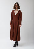 Long-sleeve A-line midi dress in rust-tone crêpe, finished with an asymmetric, partially banded V-neckline and contrast top-stitched princess seams. Ivory-tone banded trim at neckline. Drop shoulders. Ivory-tone contrast cuffs. Godet pleats. Concealed back zip fastening. Relaxed fit.