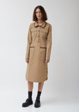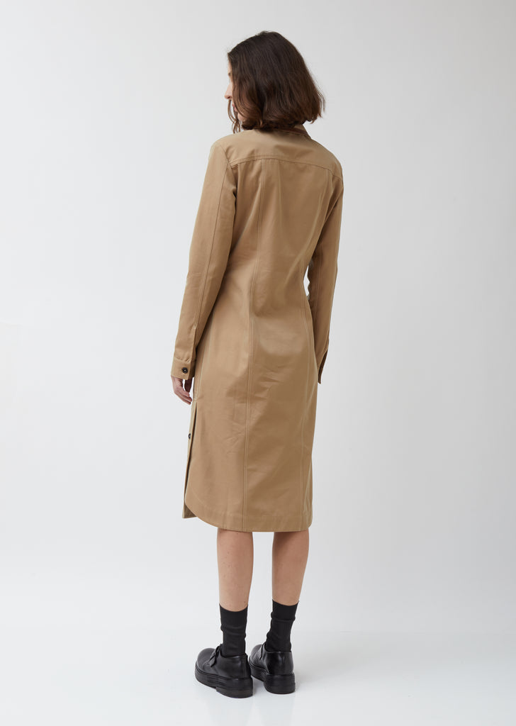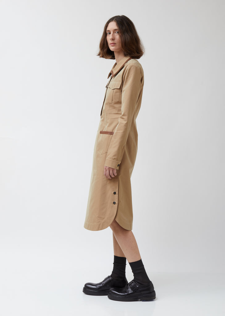 Midi-length long-sleeve safari dress in camel cotton twill, finished with outdoorsy pocket details and contrast, chocolate-tone calfskin trim throughout. Pulls over. Wide spread collar; contrast calfskin trim. Sleeve vents. Button cuffs. Raised half placket; contrast buttons. Box-pleat flap pockets at chest. Patch pockets at waist; contrast calfskin trim. Straight back shoulder yoke. Over-the-knee length. Rounded-edge vented sides; contrast-button fastening. A-line silhouette. Classic fit.