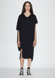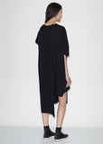 Black V-neck T-shirt dress in cotton-blend jersey, finished with asymmetric short sleeves and a squarish cutout at the right side of the hem.