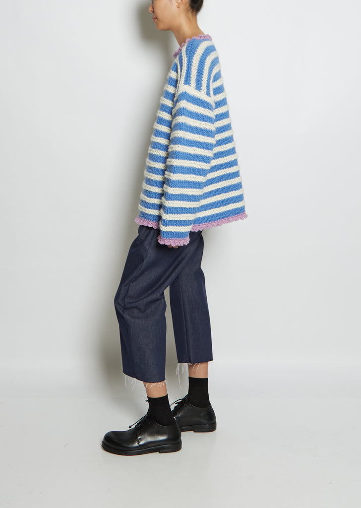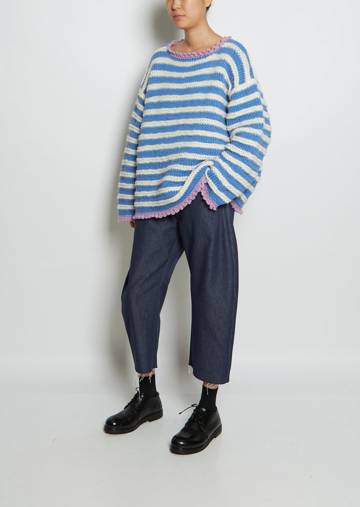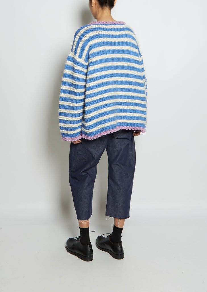 Eleph oversized hand-knit striped sweater with a purple scalloped hem, crafted in a chunky blue and white wool yarn.