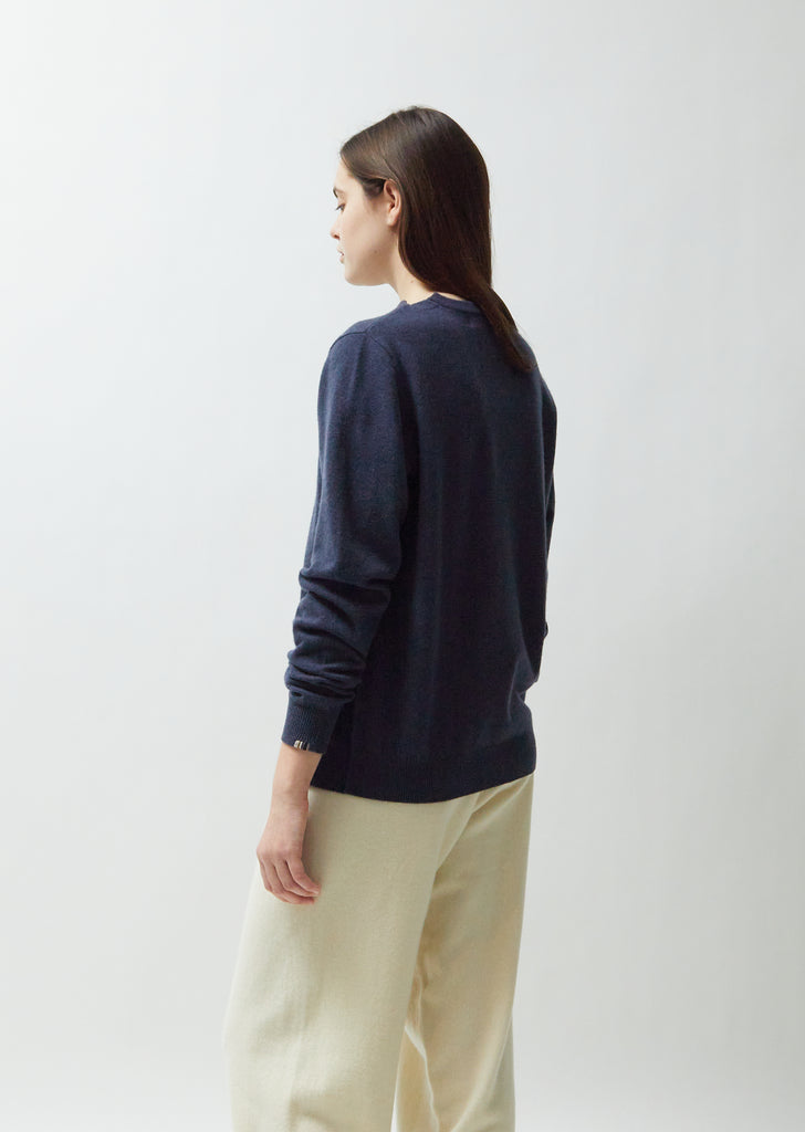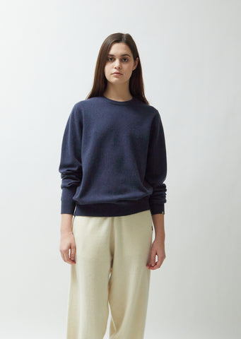 Extreme Cashmere classic denim blue crewneck sweater in a luxe cashmere blend. Features rib trim finishes at the neckline, sleeve cuffs and hem. Signature multicolored stitch stitch detailing at the sleeve cuff. Relaxed fit.