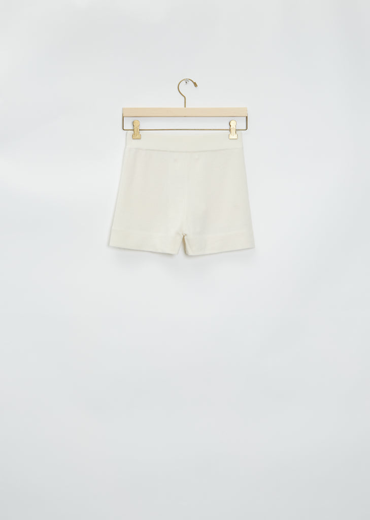 Extreme Cashmere knit shorts with ribbed waist and wide stitched hem in cashmere with a hint of stretch. Fitted silhouette.