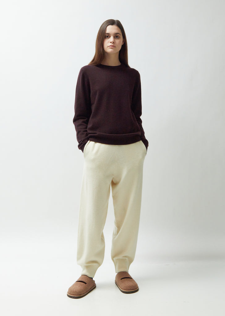 Extreme Cashmere classic plum crewneck sweater in a luxe cashmere blend. Features rib trim finishes at the neckline, sleeve cuffs and hem. Signature multicolored stitch stitch detailing at the sleeve cuff. Relaxed fit.