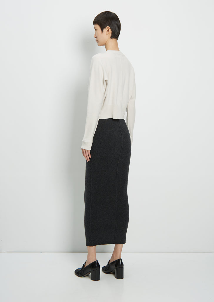 Edition 22 — Extreme Cashmere chalk crewneck cardigan sweater with a blouson fit in stretch cashmere knit. Rib trim finish at neck, sleeve cuffs and hem. Can be worn as a sweater or cardigan.
