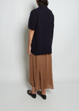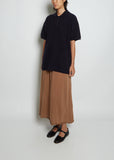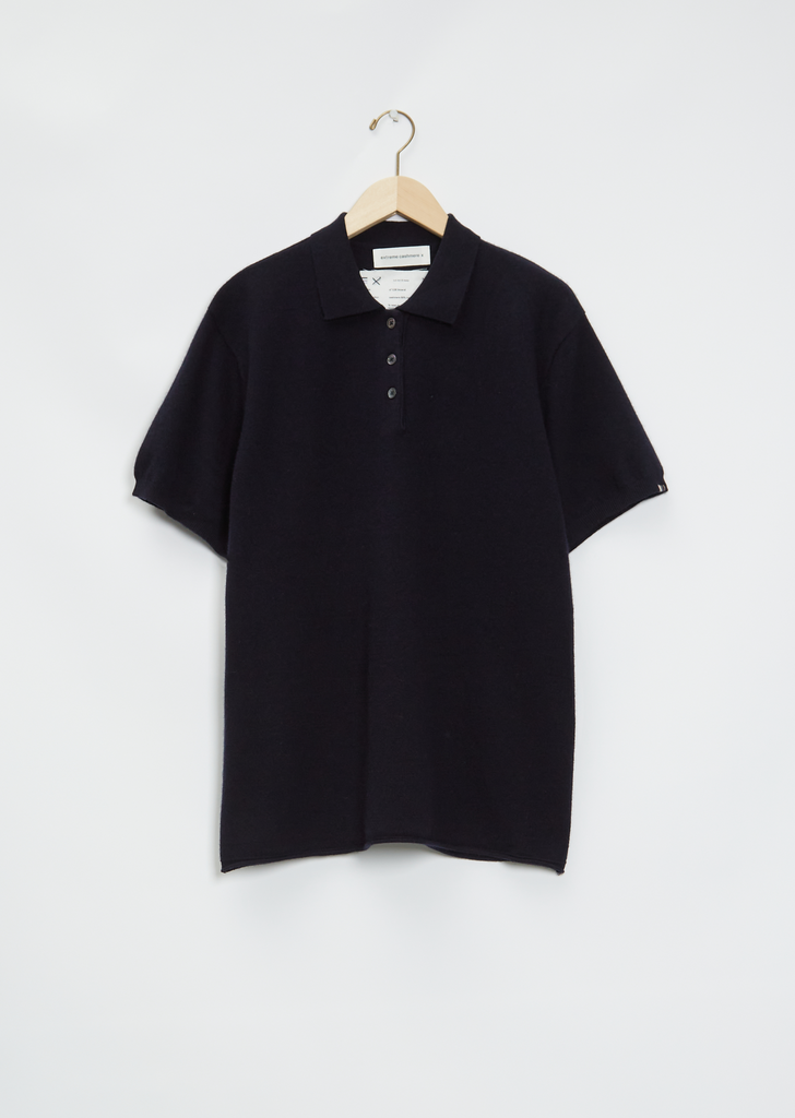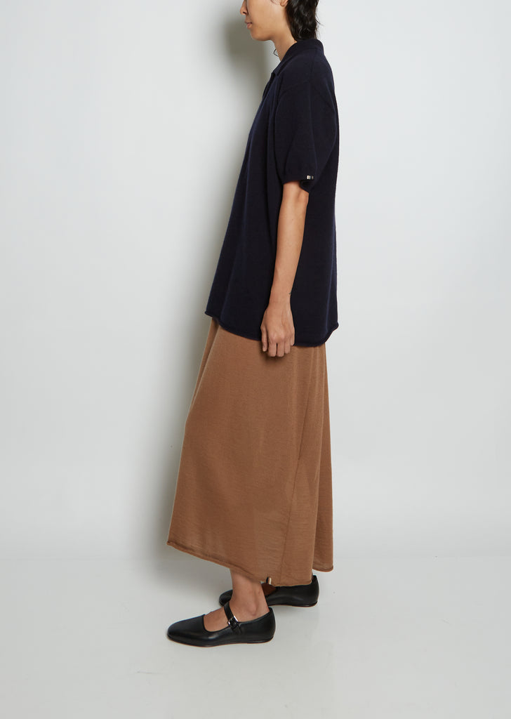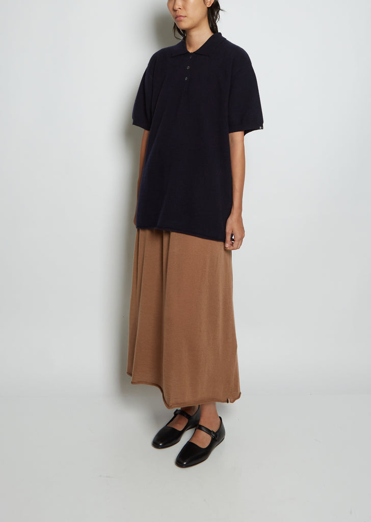 Extreme Cashmere navy polo tunic sweater with a pointed collar and short sleeves in a cashmere knit.