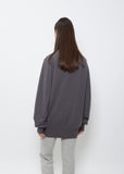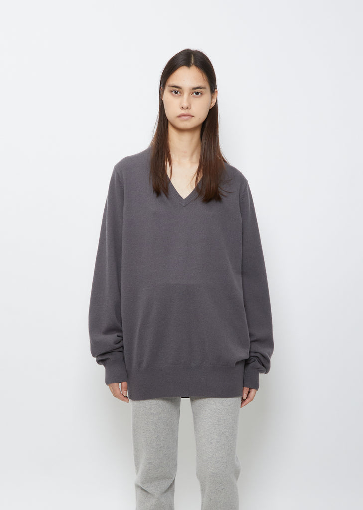 Extreme Cashmere classic v-neck pullover sweater in a slate grey luxe cashmere blend. Features rib trim finishes at neckline, sleeve cuffs and hem. Signature rainbow embroidery at left sleeve hem. Relaxed fit with elongated sleeves and hem length.
