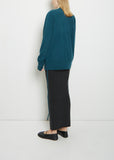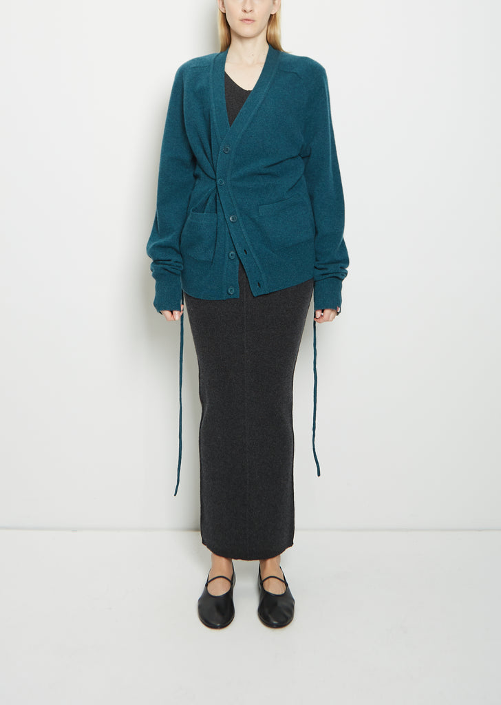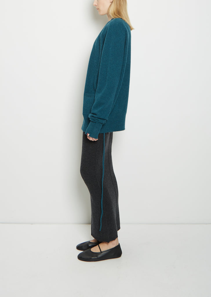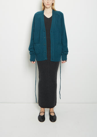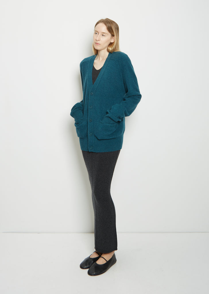 Edition 22 — Extreme Cashmere classic oversized V-neck cardigan with saddle sleeves and patch pockets in stretch cashmere blend. Features an inner drawstring and additional side button to wear fitted at waist.