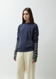 Extreme Cashmere grey fingerless mittens with extra-long sleeves and detachable cord to pull through coat in a cashmere and nylon blended knit. Signature multi colored stitching detail at top of glove.