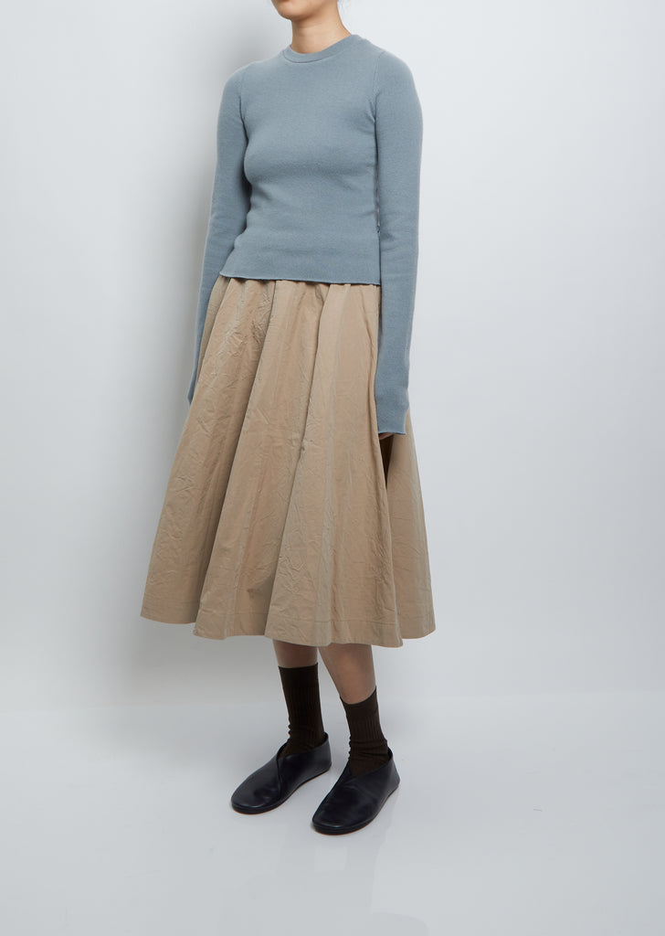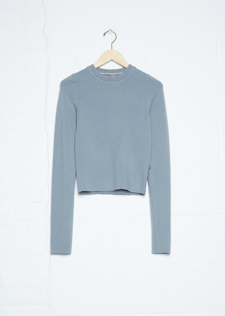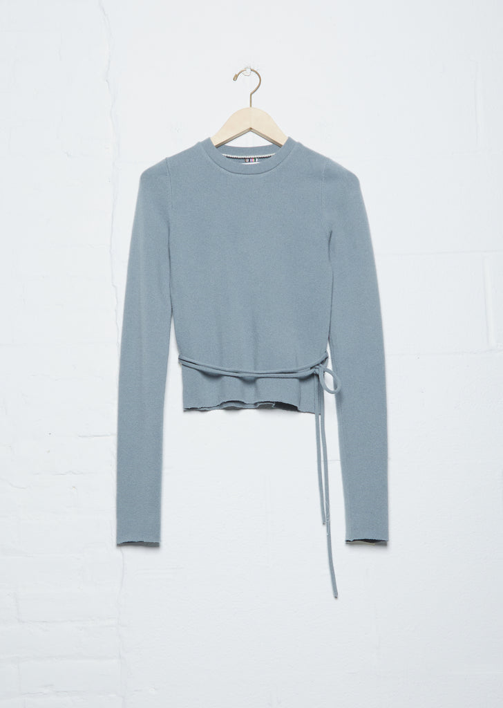 Extreme Cashmere sage blue slim crewneck sweater with extended long sleeves and removable self belt in a stretch cashmere blend knit. Also available in Chalk.