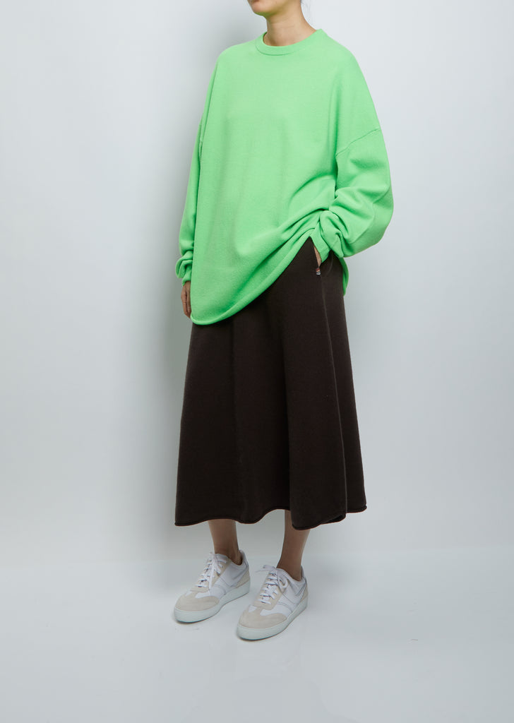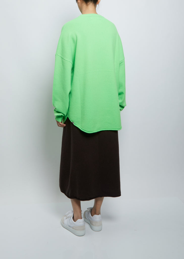Extreme Cashmere florescent green signature oversized crewneck sweater with a rounded rolled hem in stretch cashmere knit.