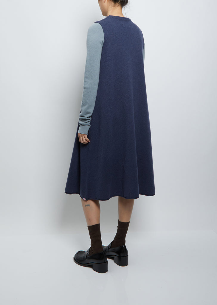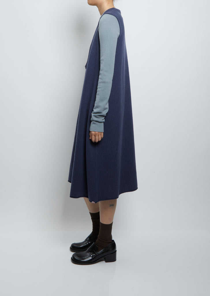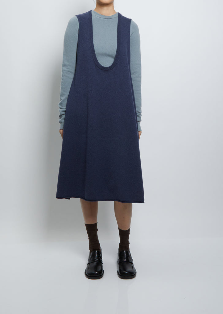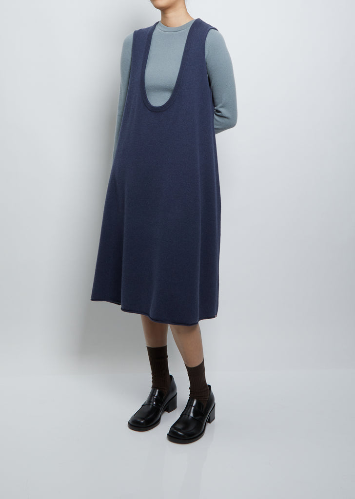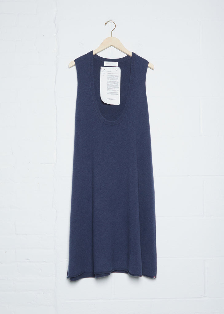 Extreme Cashmere denim blue scoop neck sleeveless sweater dress, perfect for layering over sweaters in a stretch cashmere blend knit. Also available in Sage