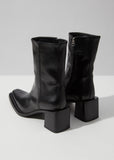 Black cowboy-inspired mid-calf booties in supple Nappa leather, designed with a squared-off pointed toe and a square stack heel.