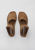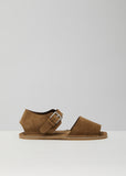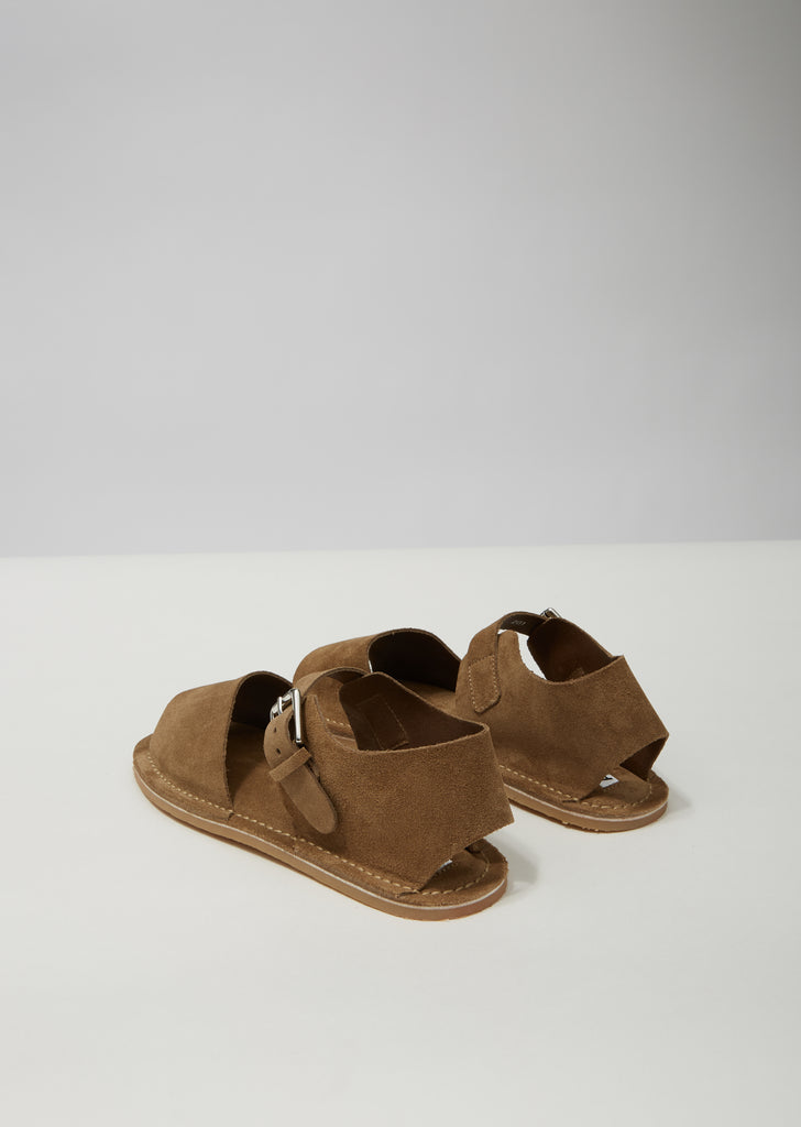 Beige soft suede open-toe sandals with a silver-tone rectangular buckle fastening on ankle strap.