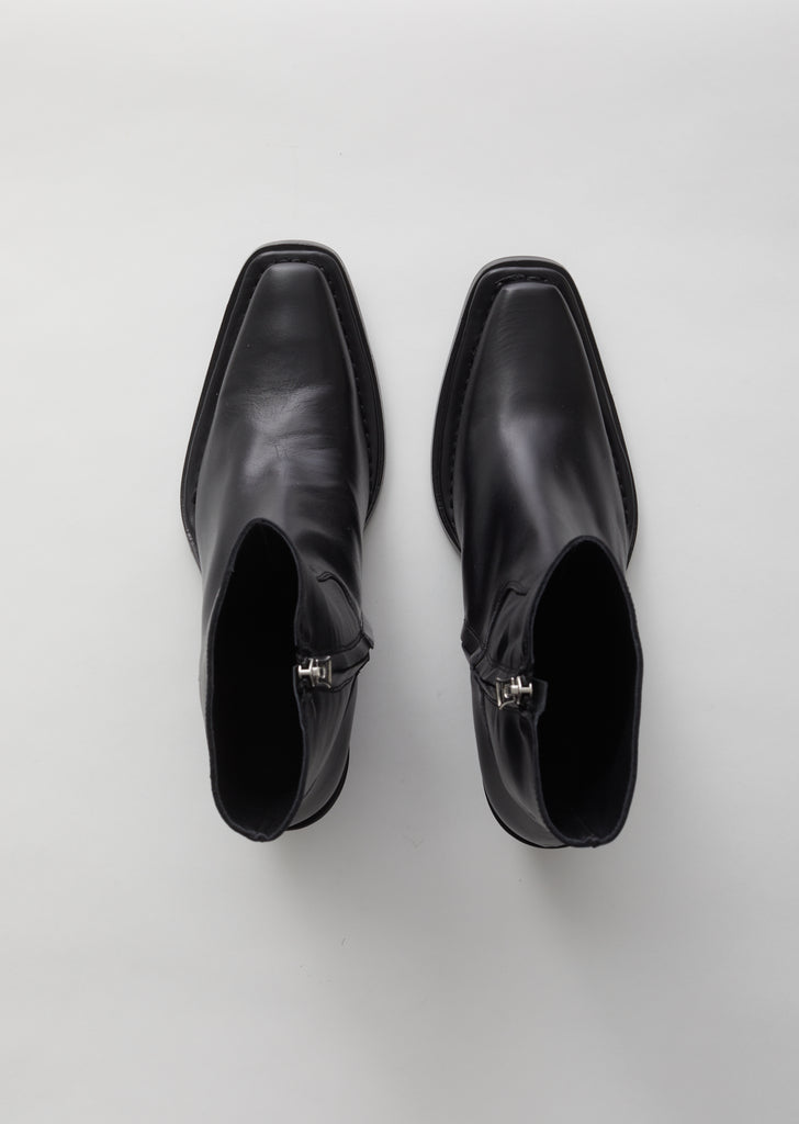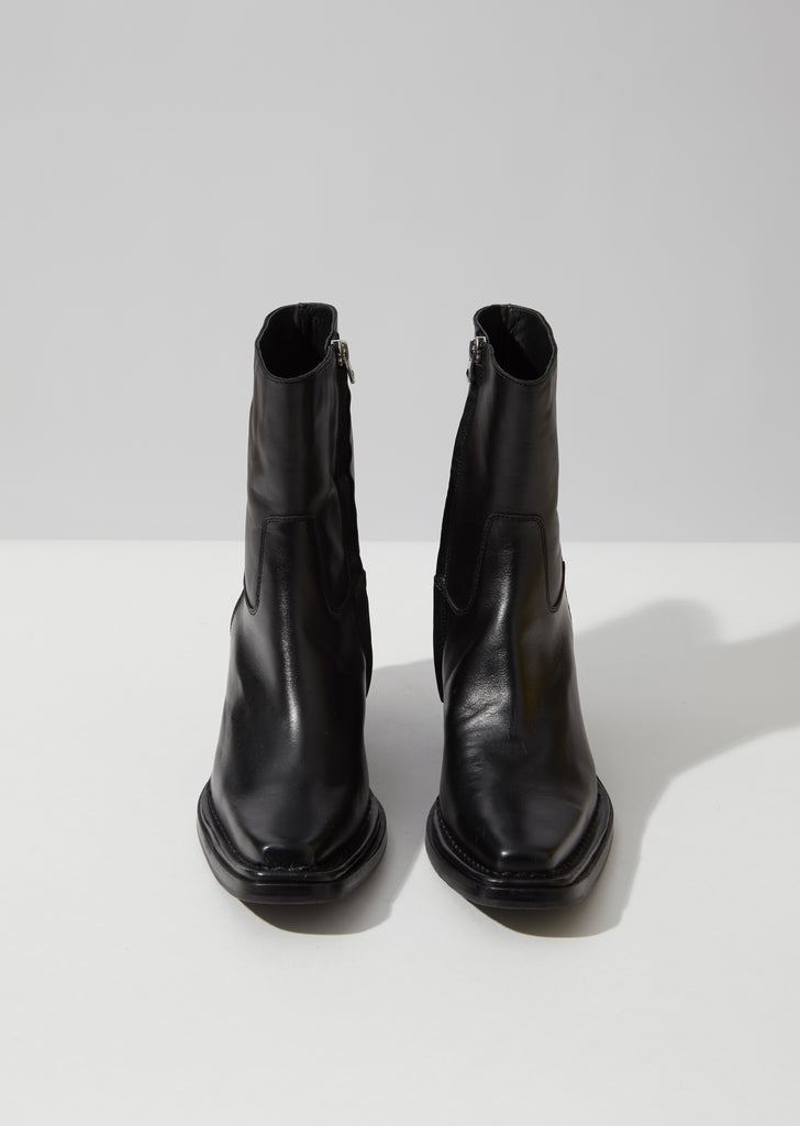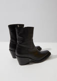 Black cowboy-inspired mid-calf booties in supple Nappa leather, designed with a squared-off pointed toe and stacked Cuban heel.