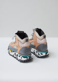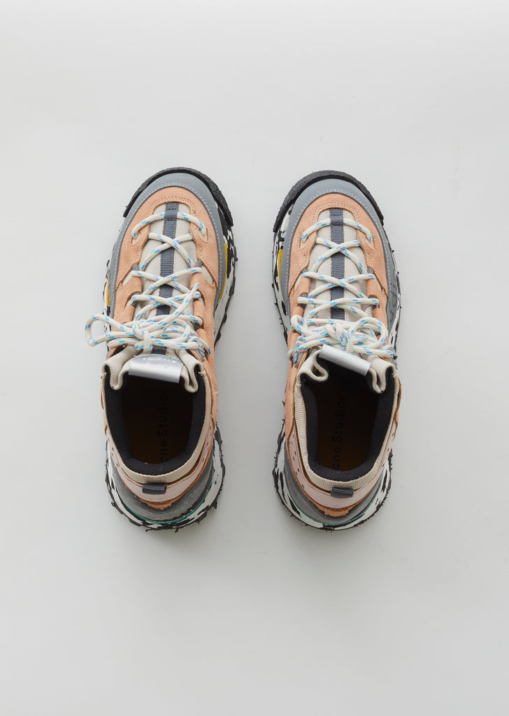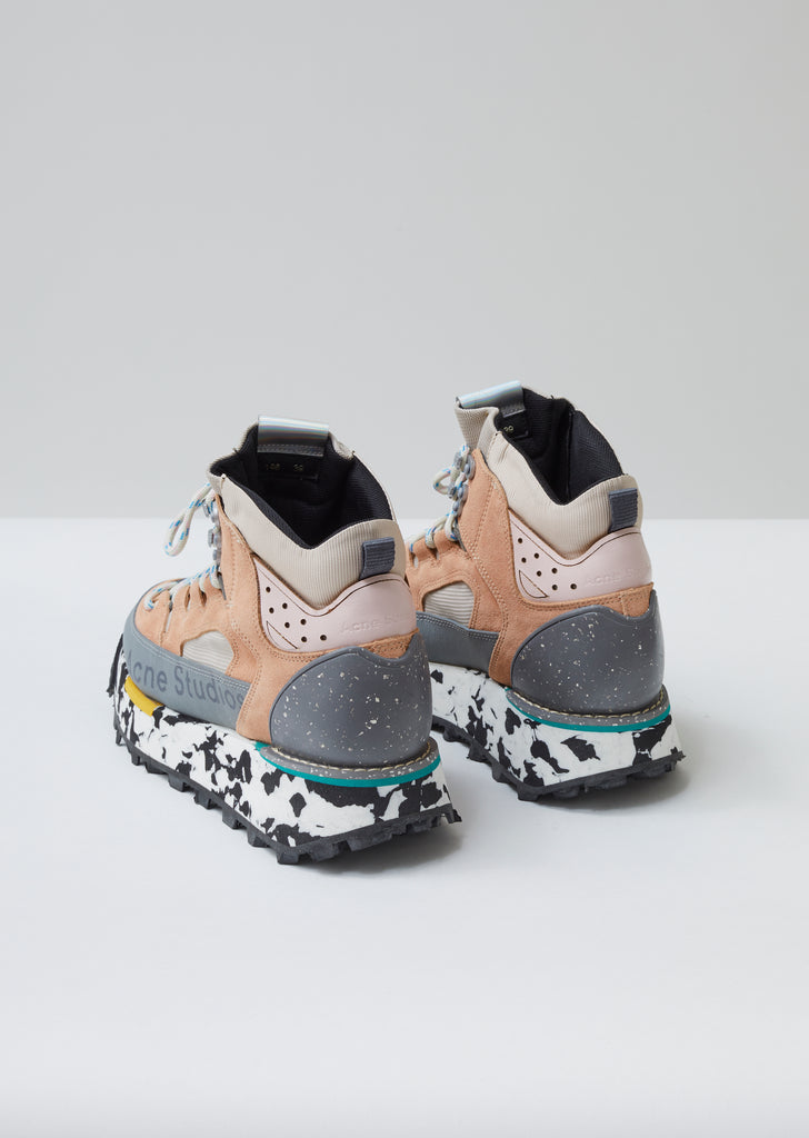 Platform-sole high-top sneaker with hiking-boot inspiration, crafted from pink and grey calfskin, suede, and mesh. Round toe. Lace-up vamp. Round woven white-and-blue laces. Holographic logo tab at tongue. Oversized logo at grey suede quarter foxing. Nylon-webbing pull tab at collar. White-speckled heel cap. Cow-print rubber midsole. Lugged black rubber outsole. Black textile lining.