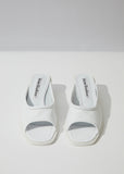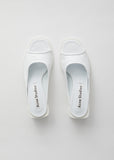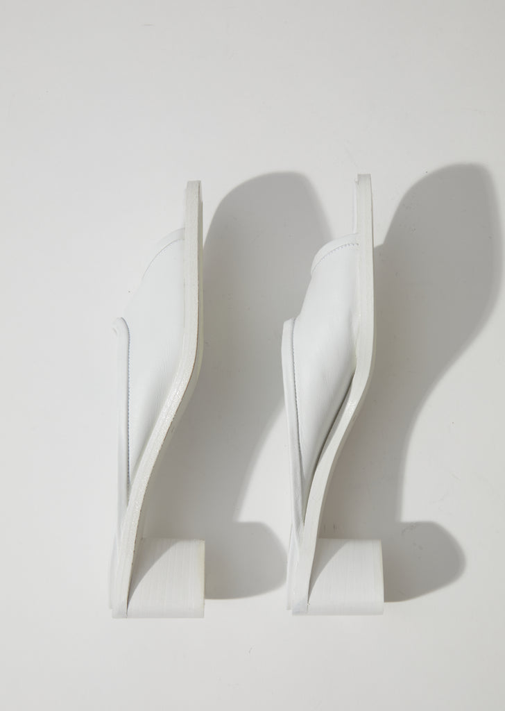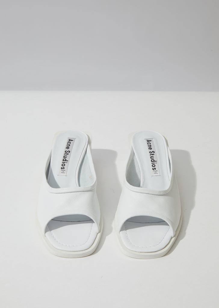 Acne Studios Bessy Mules in white. Open-toe mid-heel mule crafted of Nappa lambskin leather.