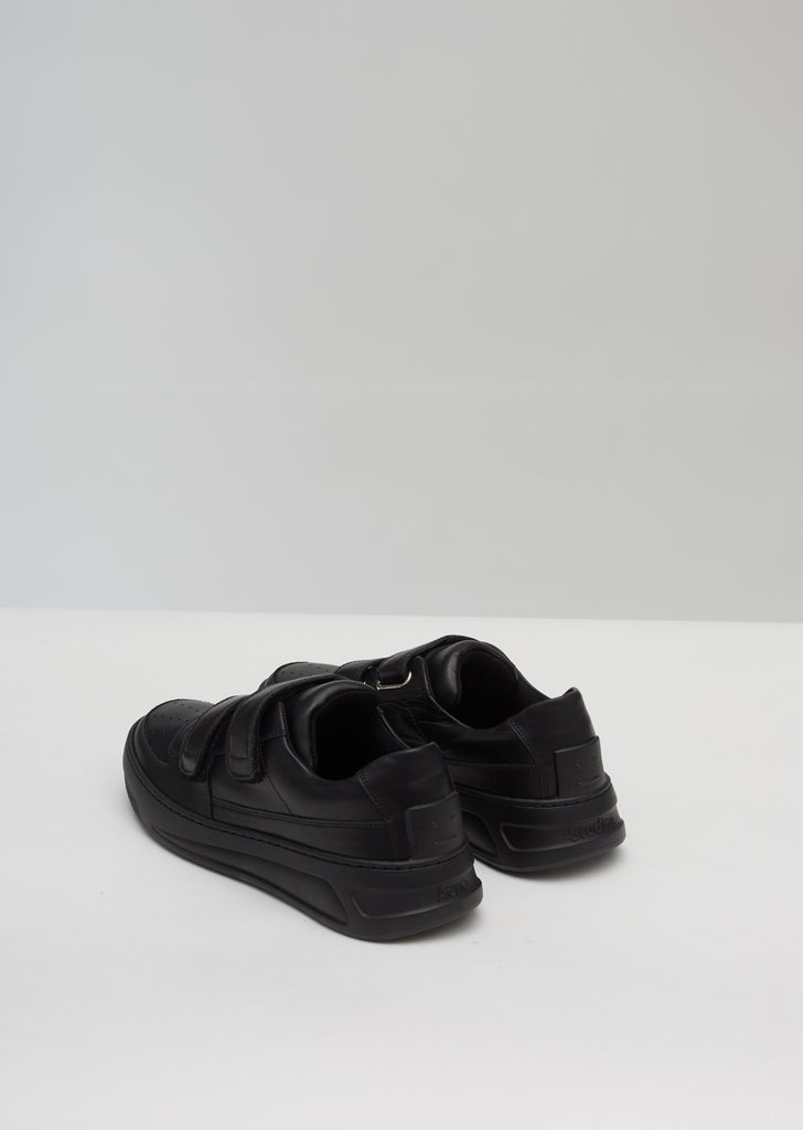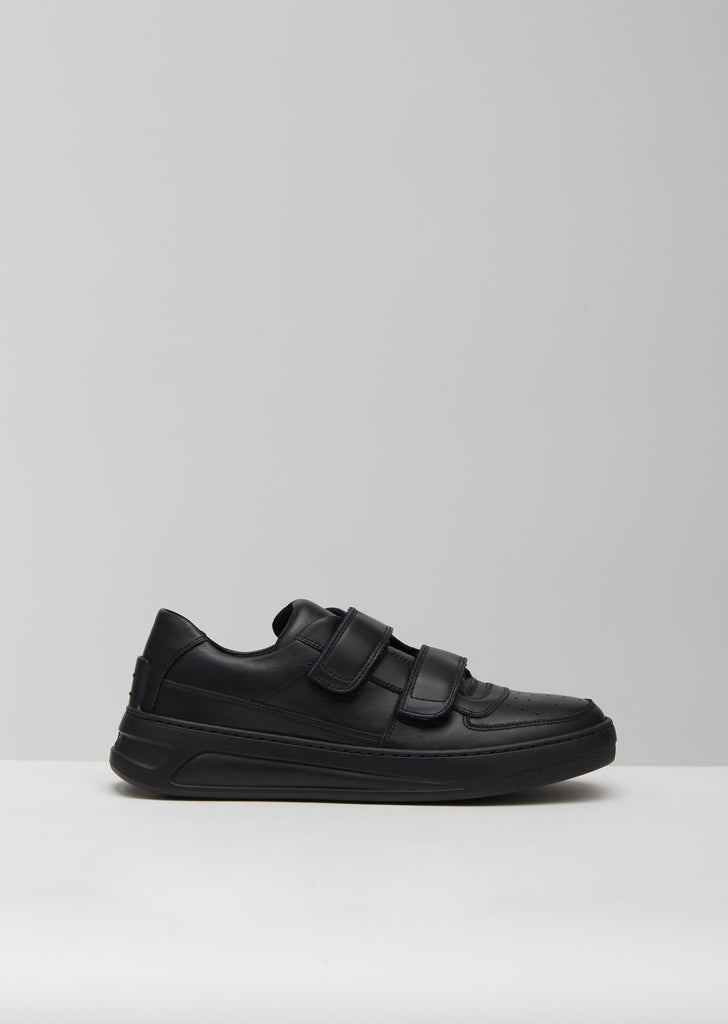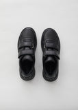 Black low-top sneakers with a buffed-leather upper and double Velcro straps. This athletic slip-on style is finished with the brand’s signature embossed rubber Face patch at the heel counter.