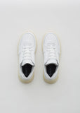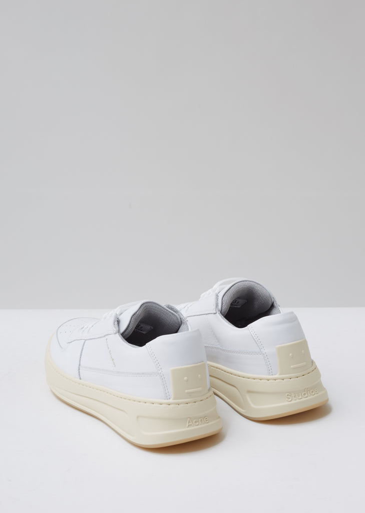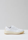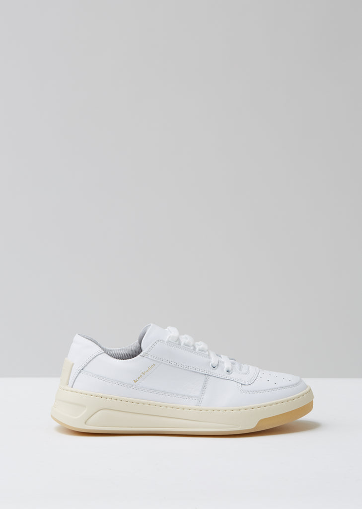 White nappa-leather low-stop sneaker with a combination lace-up closure—part grommet, part D-ring. Flat profile. Round toe. Perforated vamp. Tonal grommets and D-rings. Padded tongue. Cream-color rubberized "Face" logo tab at heel counter. Thick cream-color rubberized midsole. Tan rubberized outsole. Fabric insole. Light-grey mesh lining.
